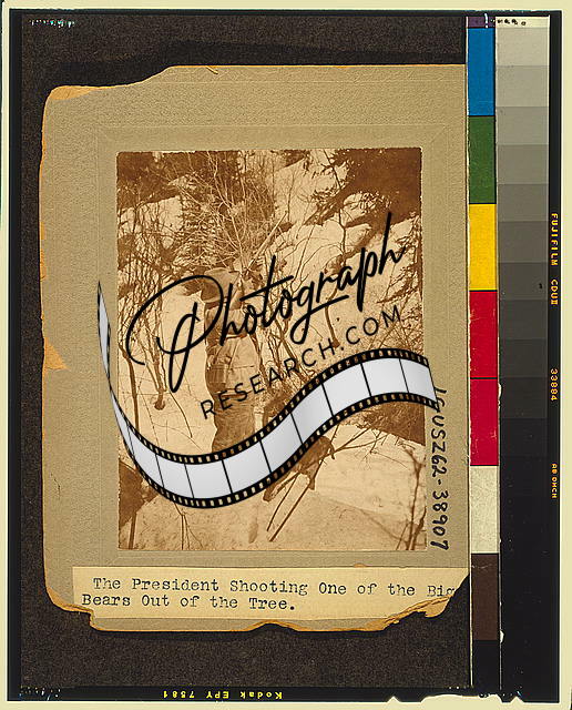 President Theodore Roosevelt shooting rifle at big bear in tree,dog,1905,Hunting