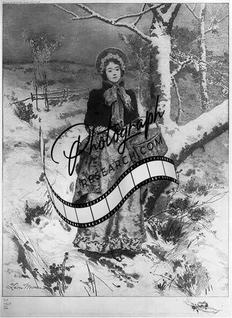 Snowflake,Young woman with basket,waking in snowy country lane,c1891,John Moran