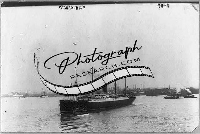 Steamship CARPATHIA,broadside view,port side,four tugboats alongside,water