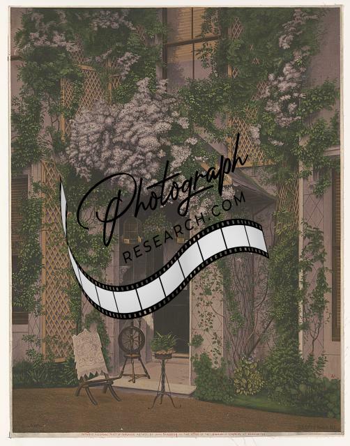House front with chair, spinning wheel, plants and bird cages in doorway.