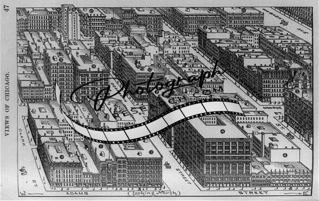 Views,Chicago,buildings,streets,corner,Adams,Dearborn street,Illinois,IL,1893