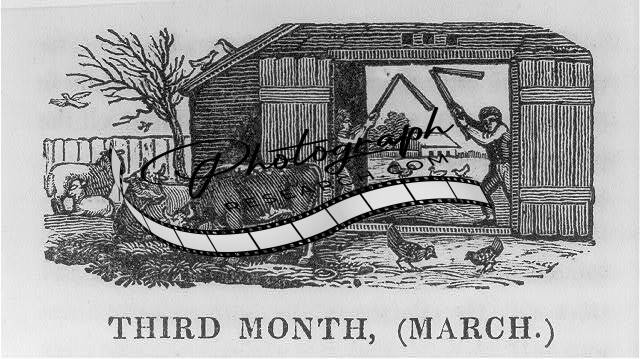 'March',2 men working in barn,farm animals,Woodcut,Alexander Anderson,1818