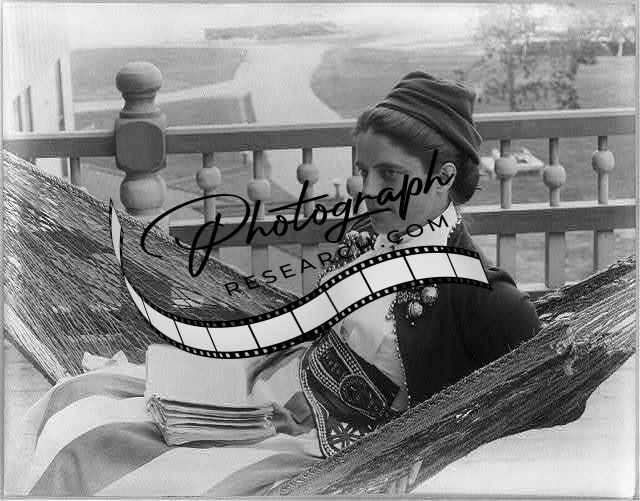 Miss Beach sitting in hammock,balcony of Kineo House,Kineo,Maine,ME,1886