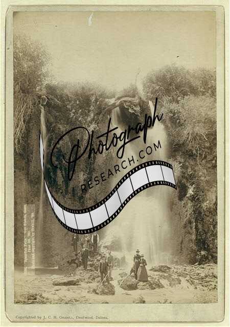 Title: 'Our picnic party at Sunday Gulch.' Photographed between the walls of the grandest mountains of the Dakotas, near Custer City on the B. & M. Ry / The Grabill Portrait and View Co., Deadwood, S. Dak.