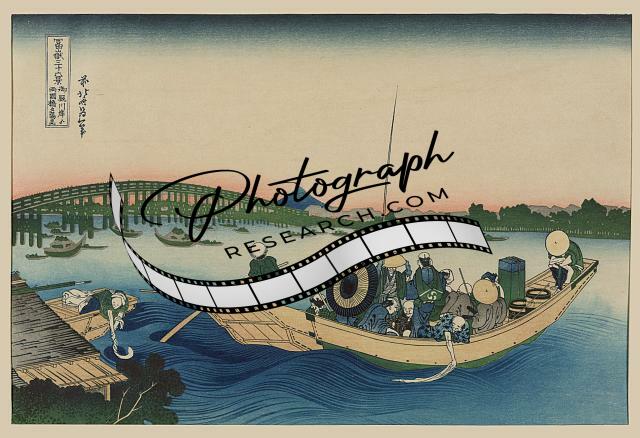 Summary: Print shows people on a raft and a person in a small boat with tall reeds in the background and a view of Mount Fuji in the distance.