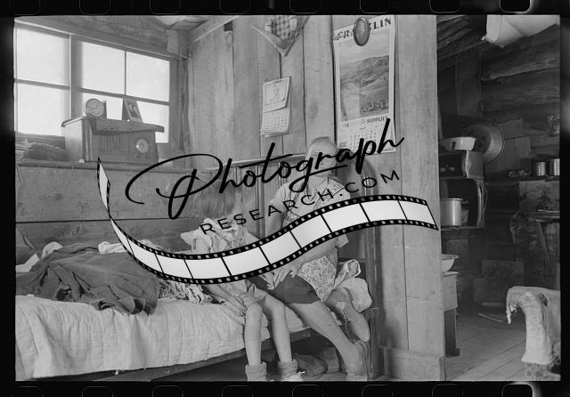Title: Mrs. Caudill and her daughter in their dugout, Pie Town, New Mexico. The Caudills have one of the few radios in their neighborhood, and many farmers and their families visit the Caudills on winter nights to listen to music and news and play Forty Two