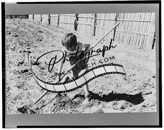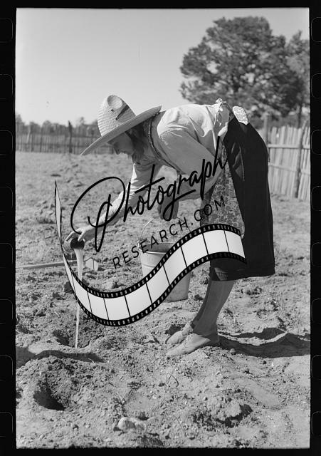 Title: Faro Caudill planting beans. The block of wood dragging after the planter is a homemade contrivance for smoothing out soil after seeds have been planted. Pie Town, New Mexico