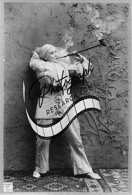 Pilar Morin as clown/mime: Full length,; smoking pipe,c1895