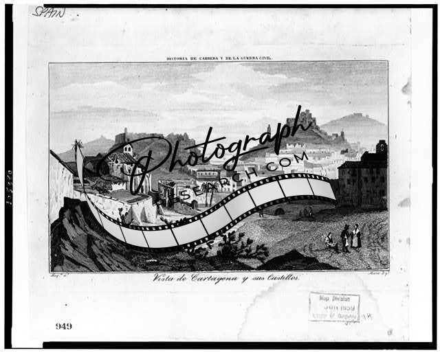 Vista de Cartagena y sus Castillos,castles,hills,book illustration,Spain,1850
