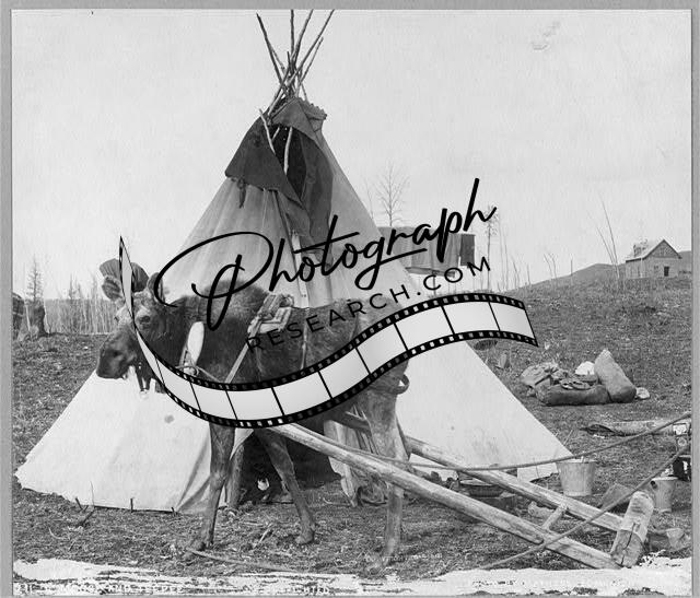 Moose harnessed for work beside tipi,Alaska,AK,United States,1916,Mathers