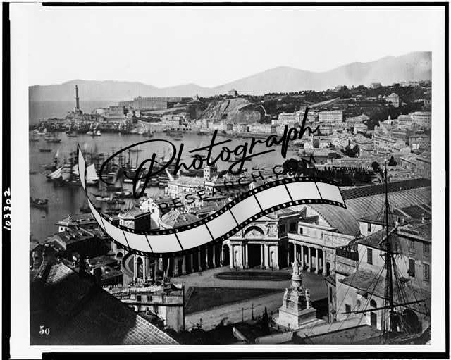 Railway station,Statue,Columbus,road,buildings,ships,harbors,Genoa,Italy,1860