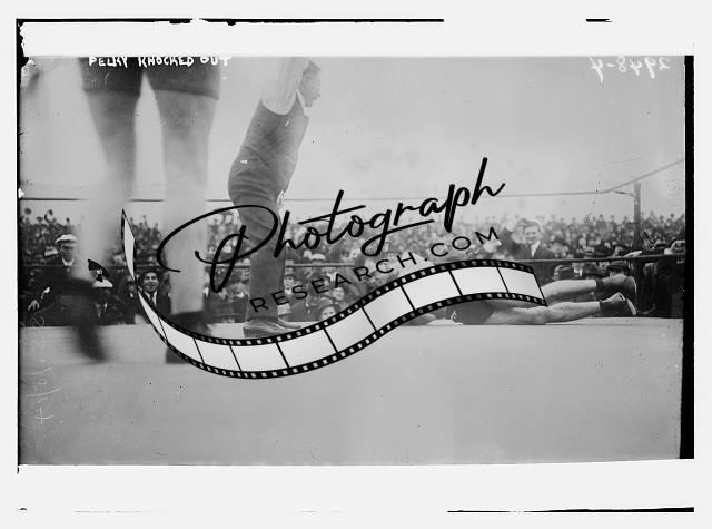 Boxer,Arthur Pelkey on ground,knocked out by Gunboat Smith,San Francisco,1914