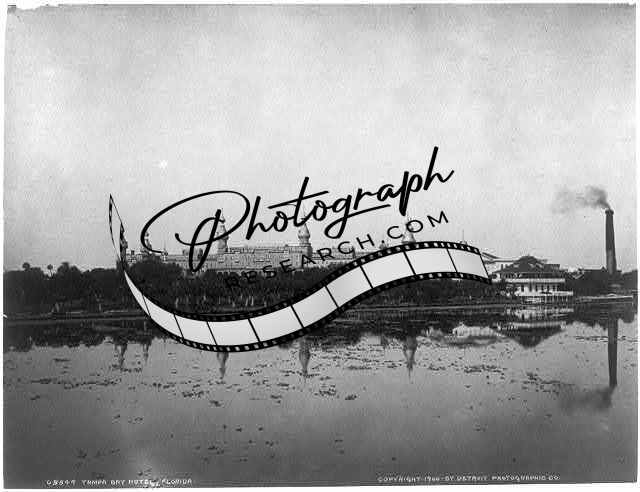 Tampa Bay Hotel,buildings,tourist,smoke stacks,water,trees,Florida,FL,1900