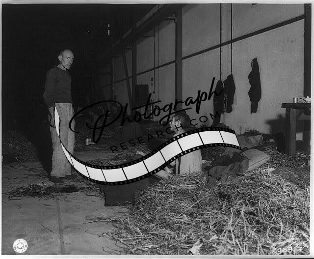 Hungarian Jews after removal from concentration camps,men lying on straw,1945