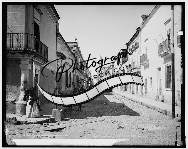 Street,streetcar tracks,buildings,roads,horses,alleys,Guadalajara,Mexico,1880