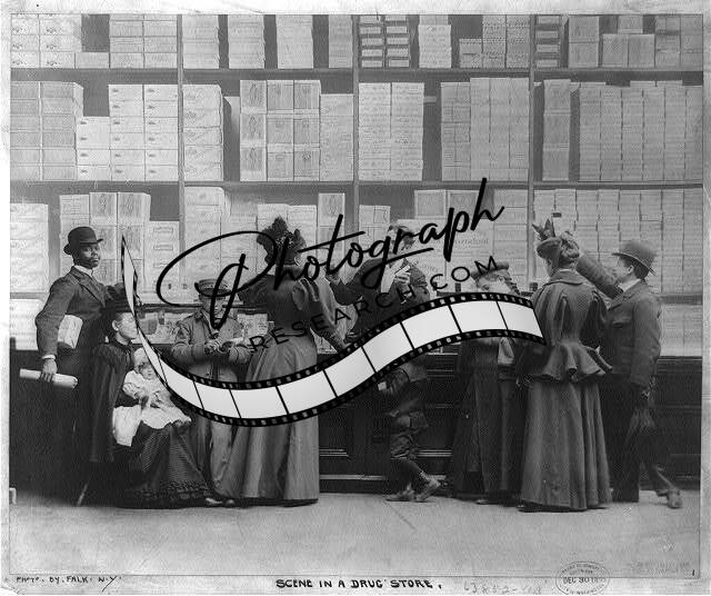 Scene in a drugstore,c1895,children,women,men,shelves,counter,Medicine