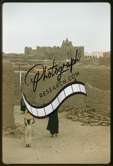 Women and a child walking near mud brick buildings, with citadel and mosque(?) in the background, Mali