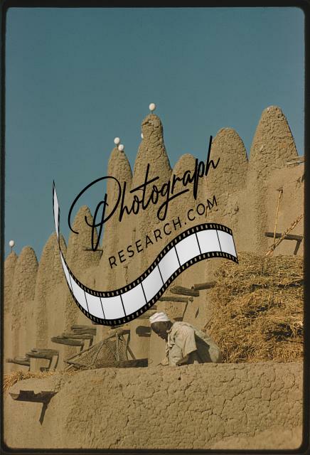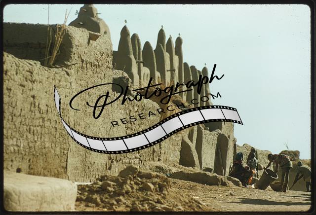 Mud mosque in Mali; people in right foreground are making mud bricks