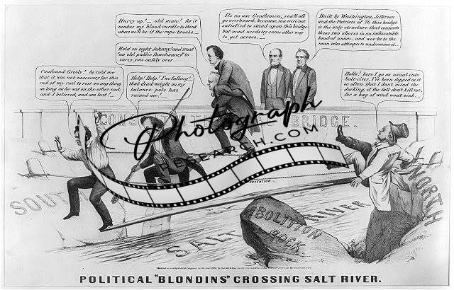 Political 'blondins' crossing salt river,c1860,men jumping off Bridge,photograph