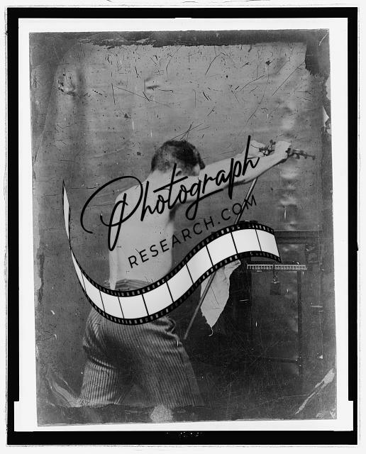 Shirtless Man pushing metal bar,attached to weighted exercise machine,1860-1900