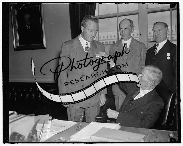 Navy Secretary Claude A Swanson presents medal to Rear Admiral Richard Byrd,1937