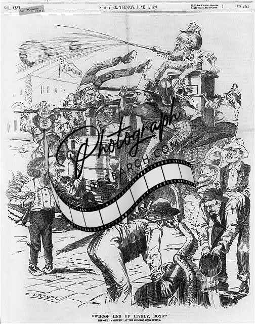 Political Cartoon,G.O.P. Senators,firemen working,1888,Chicago Convention
