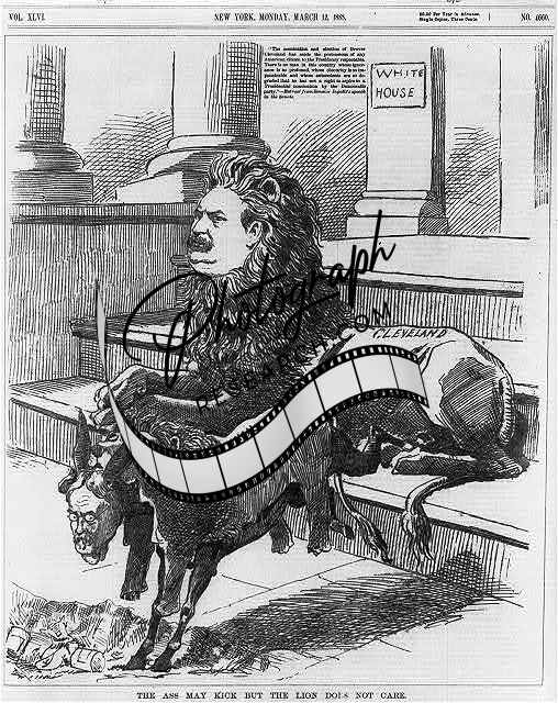 Caption card tracings: A/P/P I.; Pres. I.: BI; Caricatures and Cartoons, American 1888 Feb.; Shelf. Sources checked and other information on verso of card.