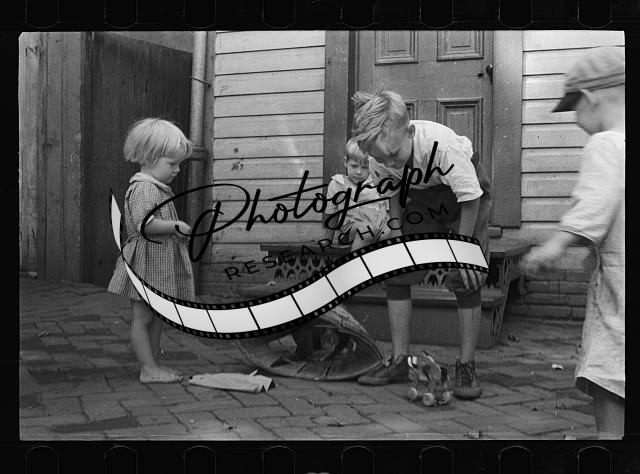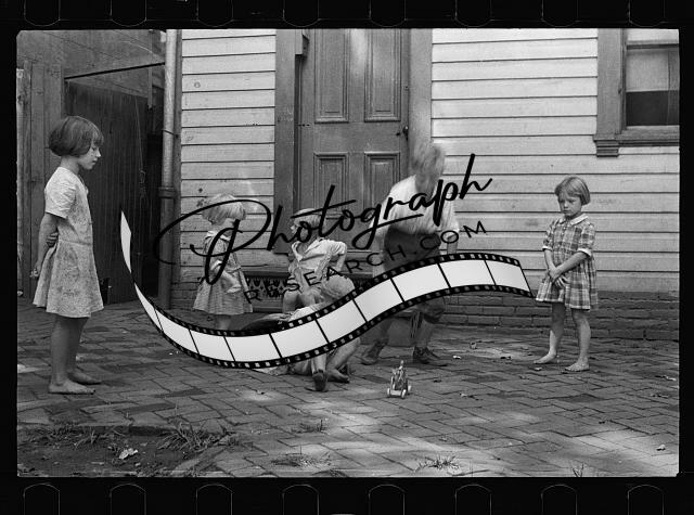 Poor white children playing,sidewalk,buildings,toy,Georgetown,Washington DC,1935