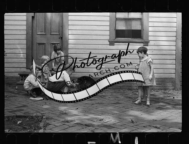 Poor white children playing,sidewalk,buildings,dog,Georgetown,Washington DC,1935 1