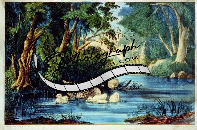 The pond in the woods,1856-1907,Currier & Ives,Photograph,duck,ducklings