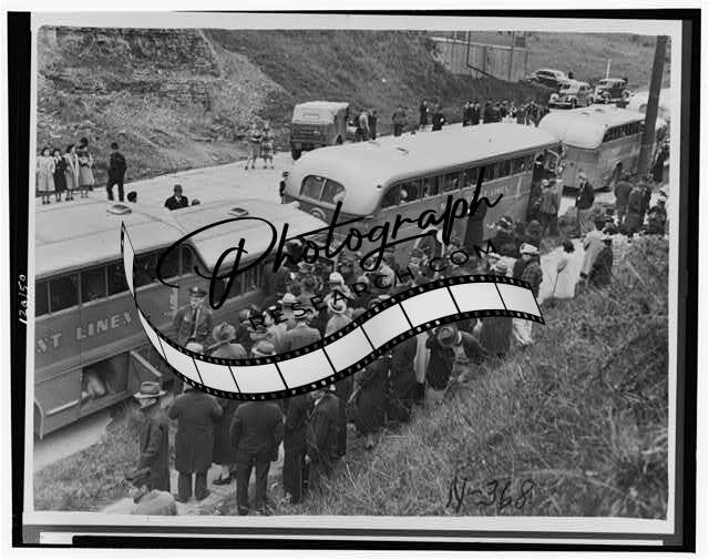 Seattle,Washington,Evacuation,Evacuees board special motor coaches,1942,Buses