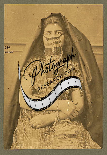 Summary: Arab woman, three-quarter length portrait, seated, facing front, much of her face covered with coin and chain ornament.