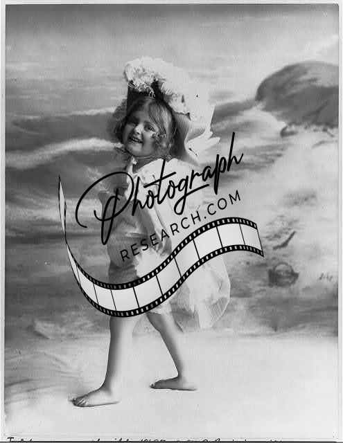 Barefoot young girl wearing dress,hat; fake beach scenery in background,c1897