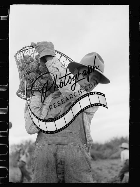 Title: Girl potato picker. The twine she carries is for sewing potato sacks. Rio Grande County, Colorado