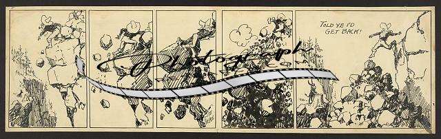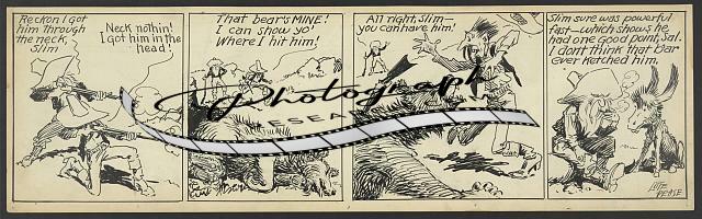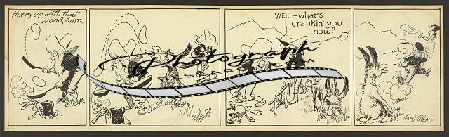 Summary: Four-panel comic strip showing Pete, an old bearded prospector and his mustachioed partner, Slim Jenkins, cooking over an open fire. When smoke gets in Pete's eyes, Slim laughs at him and Pete goes after him with a frying pan. The two end up cooking over separate fires. The cartoonist concludes: 'Prospectors are so touchy!' The strip, published in the Newark Evening News from Mar. 29-Oct. 2, 1926, was based on the cartoonist's experiences prospecting in the Klondike.