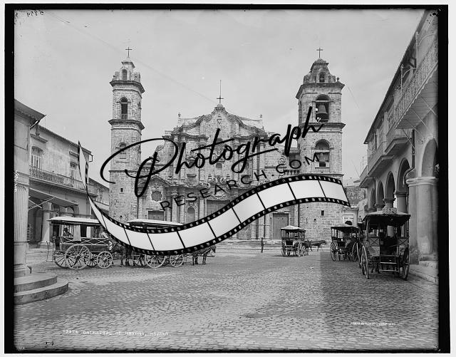 Cathedral,Havana,religious buildings,carriages,cobblestone roads,streets,c1900