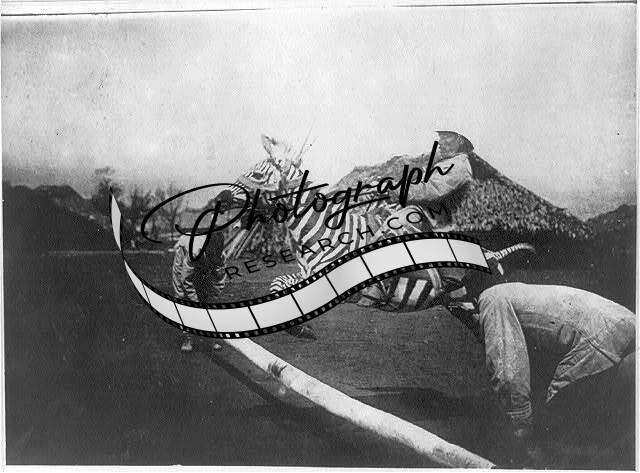Man on a tame zebra jumping a fence in East Africa,1890-1923,3 men,animal