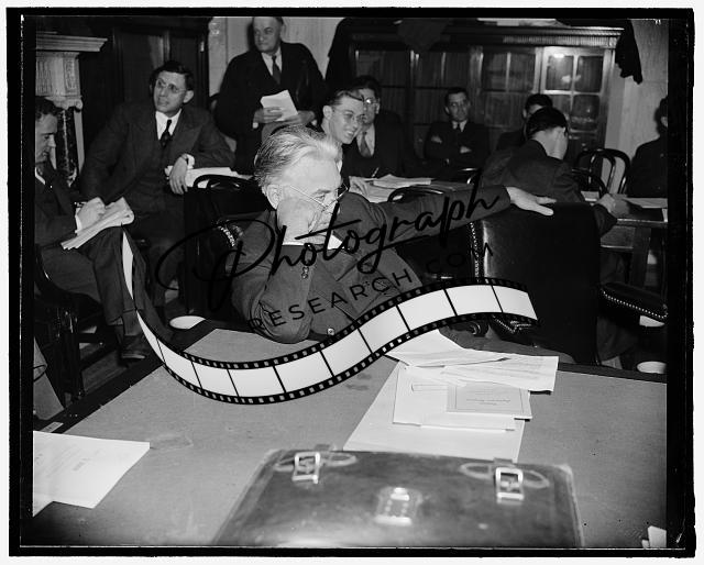 Title: Smelt served to members of Congress at special dinner. Washington, D.C., April 7 -Last night was smelt night at the Capitol and hundreds of the Finny Tribe were served to members of Congress at a special dinner sponsored by Rep. Fred Bradley of Michigan who had the fish shipped down here from his home state. Here we see Michigan Senators Prentiss Brown, left, and Arthur M. Vandenberg demonstrate the correct way of enjoying this Michigan delicacy. The girl in the picture is Miss Barbara Banks, Queen of Smelt, who helped feed the solons, while in the rear is Rep. Bradley. 4-7-39