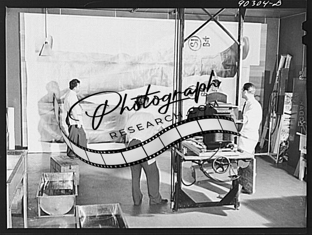 Title: Washington, D.C. Preparing the defense bond sales photomural to be installed in the Grand Central terminal, New York, in the photographic laboratory of the FSA (Farm Security Administration). Assembling print strips in the laboratory to check matching edges and tones