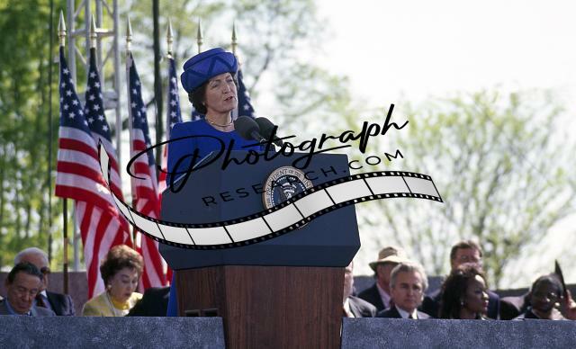 Title: President Bill Clinton speaks at the 1997 dedication of the Franklin Delano Roosevelt Memorial in Washington, D.C.