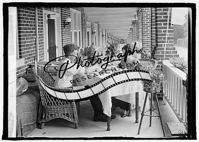 Man,woman eating at table,front porch of row house,1924,National Photo Company