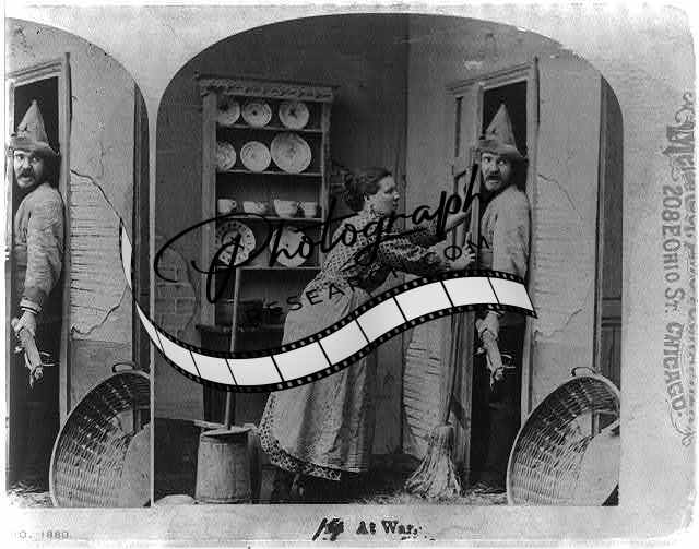At war,c1889,Photograph,woman pushing door against man in doorway,dishes