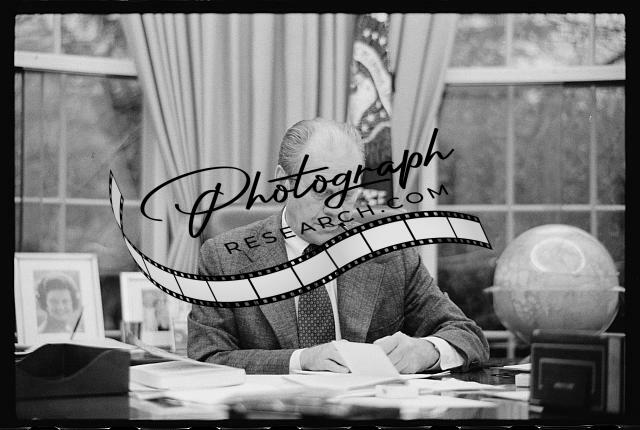 President Gerald Ford working at his desk, smoking a pipe, at the White House, Washington, D.C.