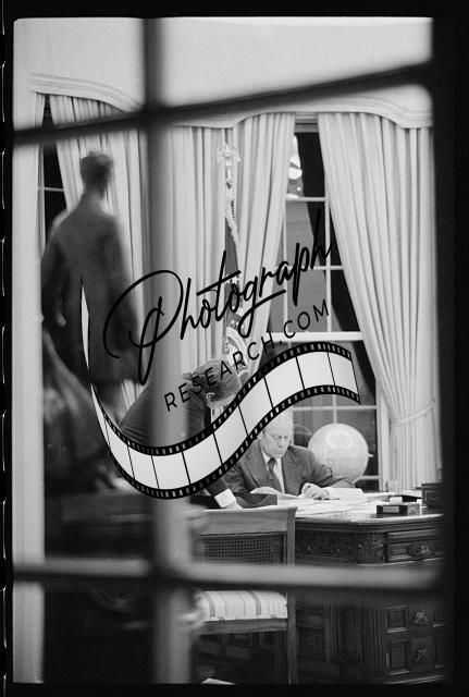 President Gerald Ford working at his desk, with an aide, at the White House, Washington, D.C.