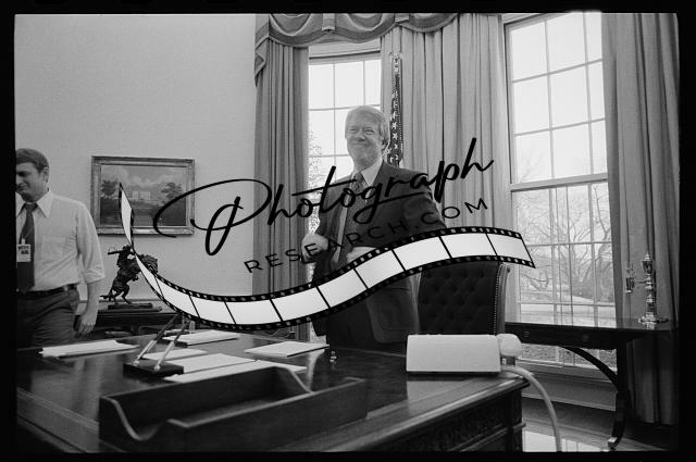 President Jimmy Carter standing behind his desk in the Oval Office of the White House, Washington, D.C.