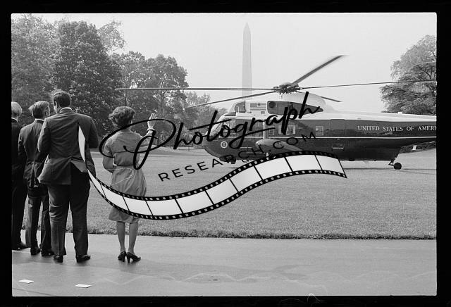 Helicopter takes off from the White House lawn as First Lady Rosalynn Carter and unidentified men wave goodbye to President Jimmy Carter, Washington, D.C.