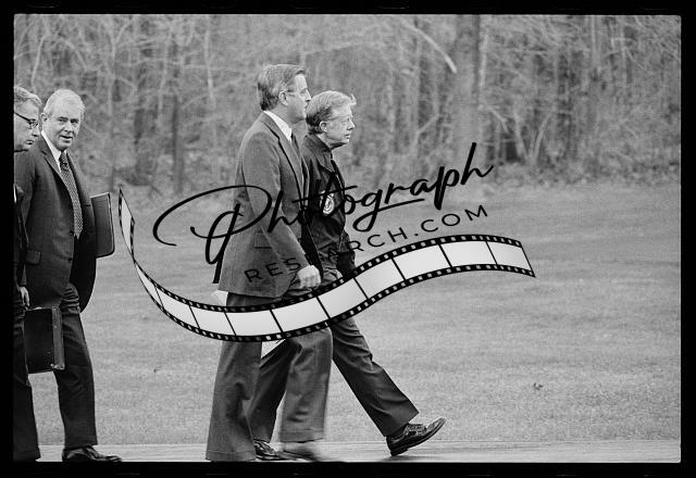 President Jimmy Carter, Vice President Walter Mondale, Secretary of State Cyrus Vance, and Secretary of Defense Harold Brown after disembarking from their helicopter to meet about the Iran Hostage Crisis at Camp David, Maryland
