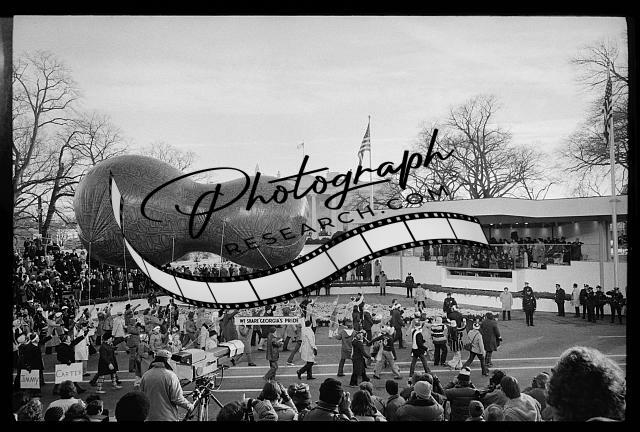 Peanut-shaped float passes by reviewing stand for the inauguration of Jimmy Carter to President, Washington, D.C.