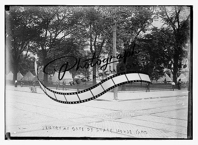 Sentry at gate of State House yard,sidewalk,fence,Bain News Service