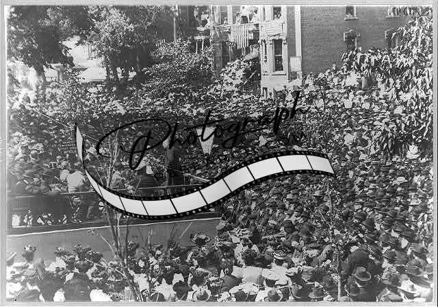President Theodore Roosevelt,platform speaking,group,veterans,crowds,c1903